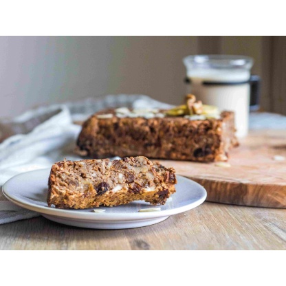 Zutaten der Marillenkuchen Backmischung: Haferflockenmehl*, getrocknete Marillenstücke*, geröstete Walnüsse*, Flohsamenschalenmehl*, Zimt*, Backpulver (*Zutaten aus biologischer Landwirtschaft)